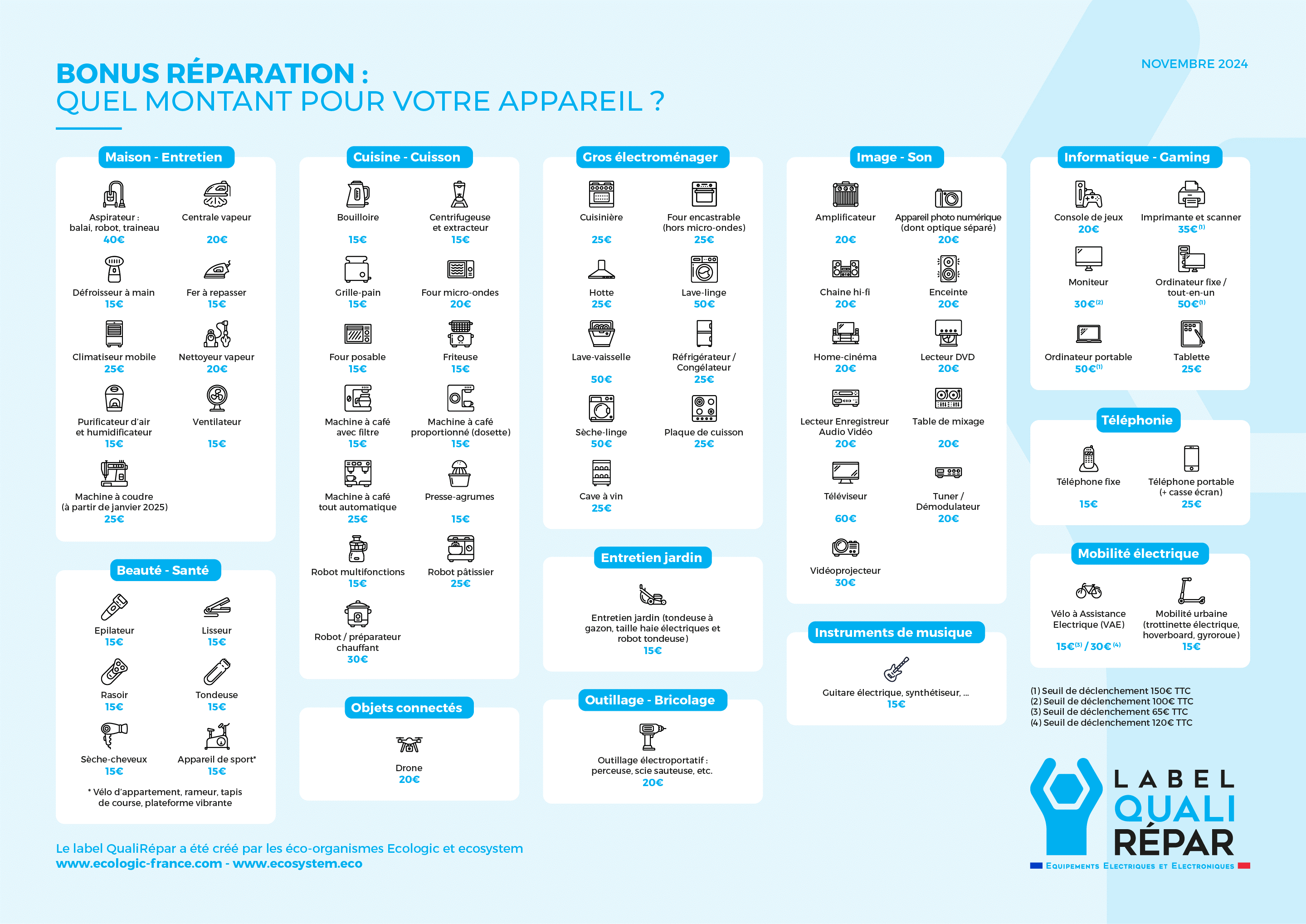 Consultez ci-dessous la liste des équipements éligibles et les montants du Bonus Réparation correspondant : (cliquez sur l'image pour l'agrandir)